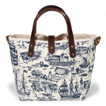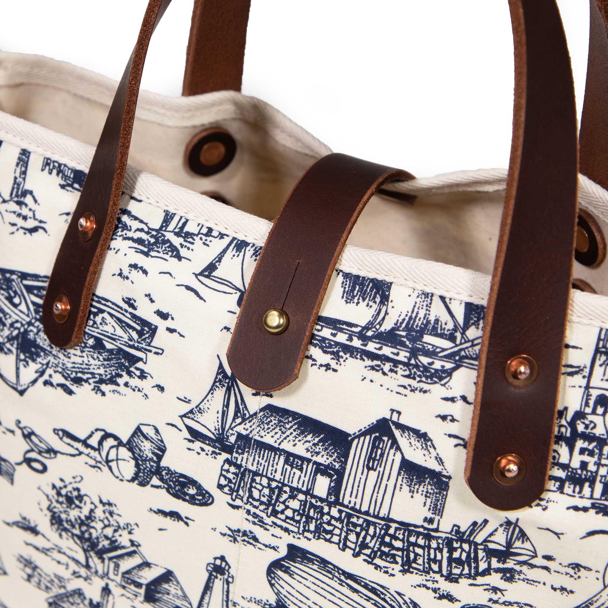 Features: Navy and white nautical toile cotton exterior with sailboats, lighthouses, and coastal scenes. Split interior pocket keeps phone, wallet, keys, and essentials organized. Mahogany leather handles with copper rivets and brass snap-button closure. Water-repellent cotton canvas lining. Wide base for easy access—no more digging around. Reinforced bound seams for durability. Made in USA.