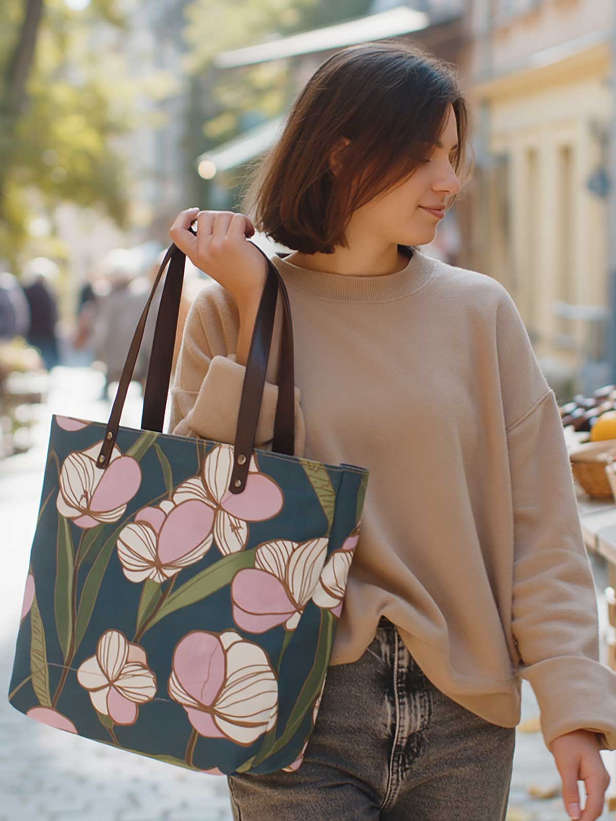 tote with floral pattern in pink and blue, with brown leather handles