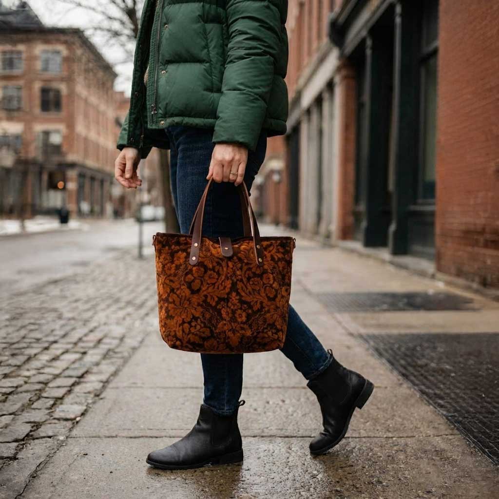 Inside, a split pocket keeps phone, wallet, keys, and glasses organized, while the roomy base and shallow profile make everything easy to see and grab. Rich mahogany leather handles and a matching center strap with solid brass closure add durability and polish, reinforced with copper rivets and velvet bound seams. A water-repellent cotton canvas lining keeps belongings protected.