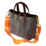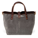 Inside, a split pocket keeps phone, wallet, keys, and glasses organized, while the roomy base and shallow profile make everything easy to see and grab. Rich mahogany leather handles and a matching center strap with solid brass closure add durability and polish, reinforced with copper rivets and velvet bound seams. A water-repellent cotton canvas lining keeps belongings protected.