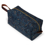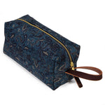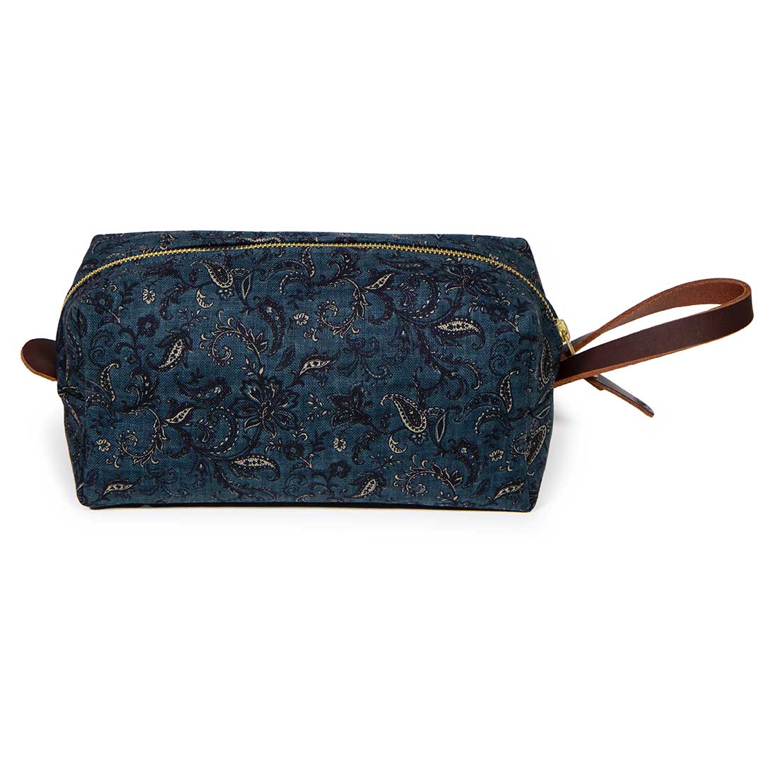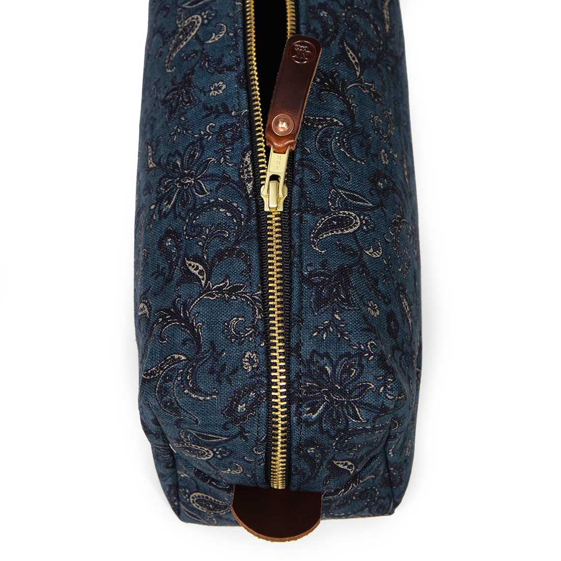 Our Limited Edition travel kits (dopp kits or toiletry bags) will keep you organized and stylish whether you are taking the trip of a lifetime or just heading out for a long weekend. This particular kit features a deep indigo paisley cotton printed in Japan.   Aside from the outer fabric, taped seams and a water-resistant cotton canvas lining help to protect all of your valuables from the occasional leaky bottle. Sturdy mahogany leather handles and pulls add to the look and durability of the kit.
