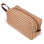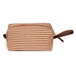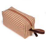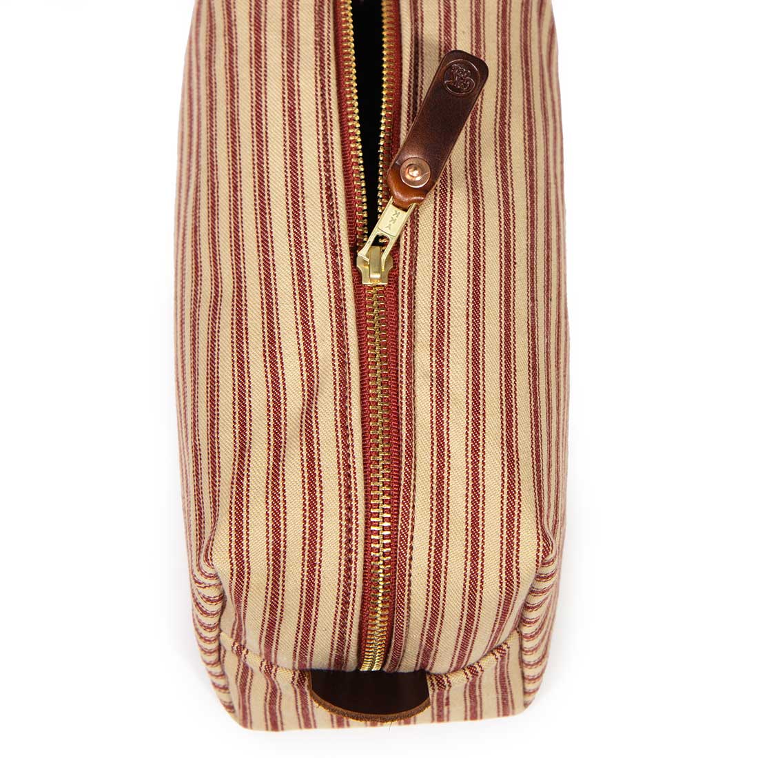 Our Limited Edition travel kits (dopp kits or toiletry bags) will keep you organized and stylish whether you are taking the trip of a lifetime or just heading out for a long weekend. This particular kit features a classic cotton ticking stripe in Barn Red. Aside from the outer fabric, taped seams and a water-resistant cotton canvas lining help to protect all of your valuables from the occasional leaky bottle. Sturdy mahogany leather handles and pulls add to the look and durability of the kit.