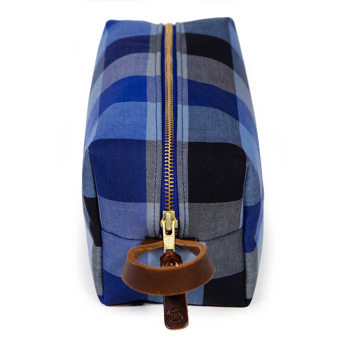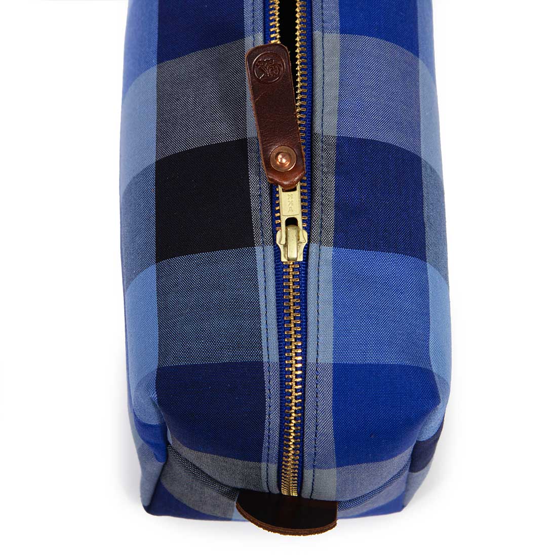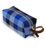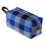 Our Limited Edition travel kits (dopp kits or toiletry bags) will keep you organized and stylish whether you are taking the trip of a lifetime or just heading out for a long weekend. This particular kit features a bold vintage cotton check in shades of blue. Aside from the outer fabric, taped seams and a water-resistant cotton canvas lining help to protect all of your valuables from the occasional leaky bottle. Sturdy mahogany leather handles and pulls add to the look and durability of the kit.