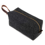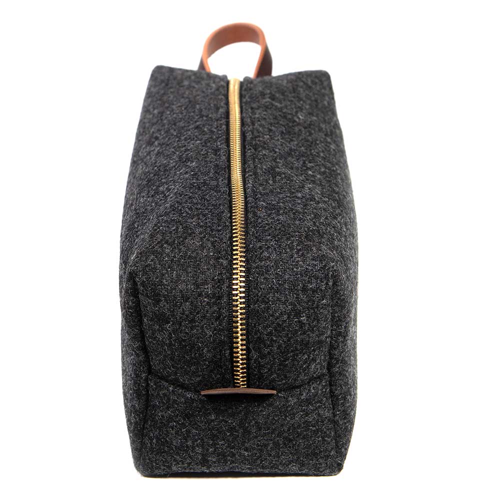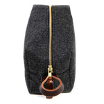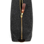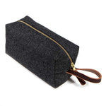 Our Limited Edition travel kits (dopp kits or toiletry bags) will keep you organized and stylish whether you are taking the trip of a lifetime or just heading out for a long weekend. This particular travel piece features a sophisticated charcoal grey wool.  Aside from the outer fabric, taped seams and a water-resistant cotton canvas lining help to protect all of your valuables from the occasional leaky bottle. Sturdy mahogany leather handles and pulls add to the look and durability of the kit.