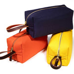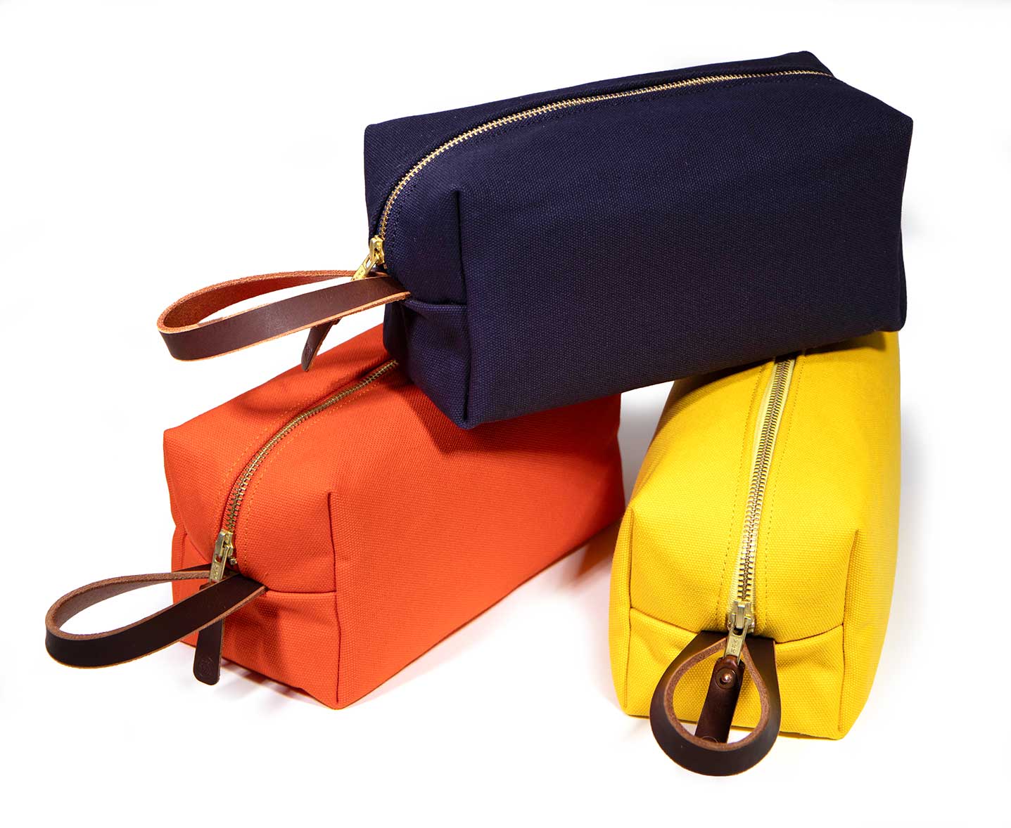 Our Limited Edition travel kits (dopp kits or toiletry bags) will keep you organized and stylish whether you are taking the trip of a lifetime or just heading out for a long weekend. Our sturdy canvas kits in solid colors are utilitarian and sophisticated at the same time. Aside from the outer fabric, taped seams and a water-resistant cotton canvas lining help to protect all of your valuables from the occasional leaky bottle. Sturdy mahogany leather handles and pulls add to the look and durability of the kit.