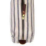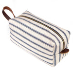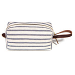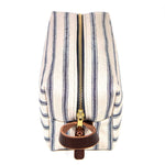 Our Limited Edition travel kits (dopp kits or toiletry bags) will keep you organized and stylish whether you are taking the trip of a lifetime or just heading out for a long weekend. This particular kit features a breezy linen stripe in flax, navy and white.   Aside from the outer fabric, taped seams and a water-resistant cotton canvas lining help to protect all of your valuables from the occasional leaky bottle. Sturdy mahogany leather handles and pulls add to the look and durability of the kit.
