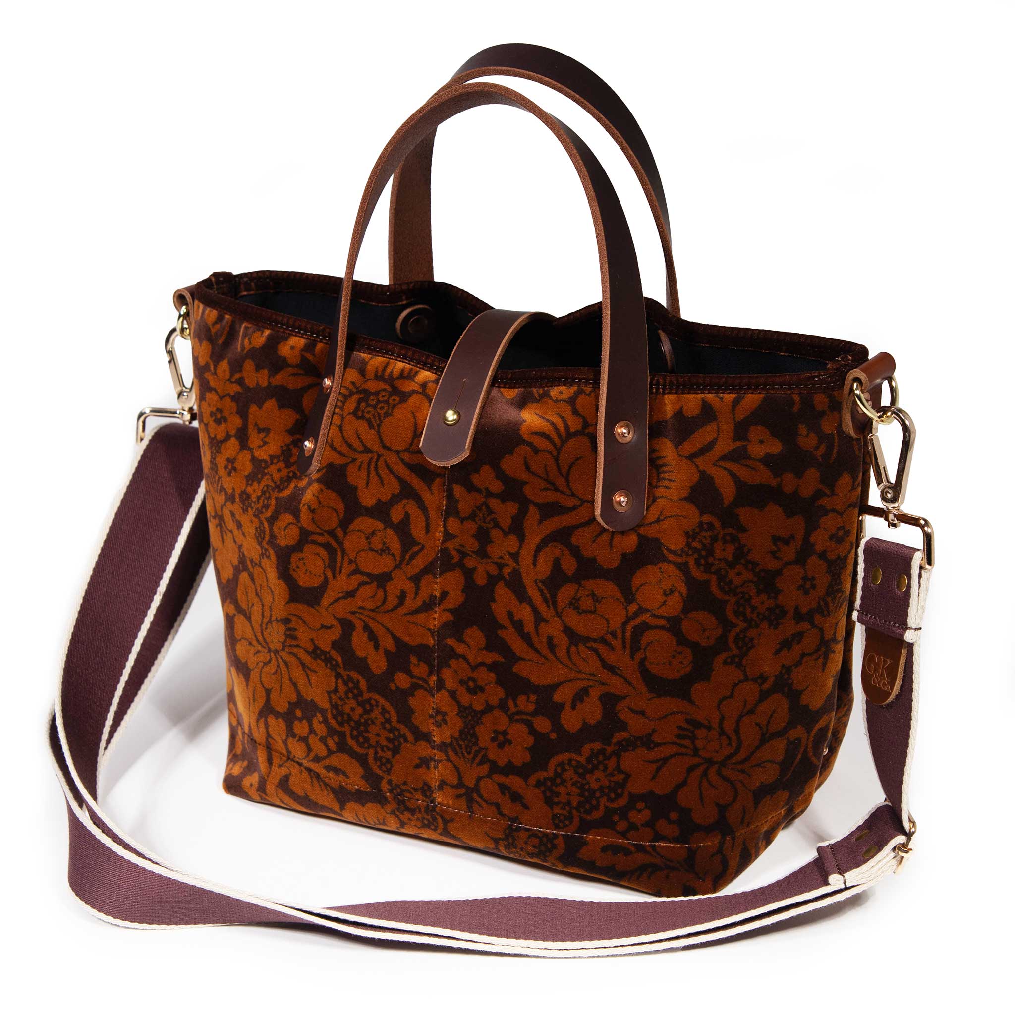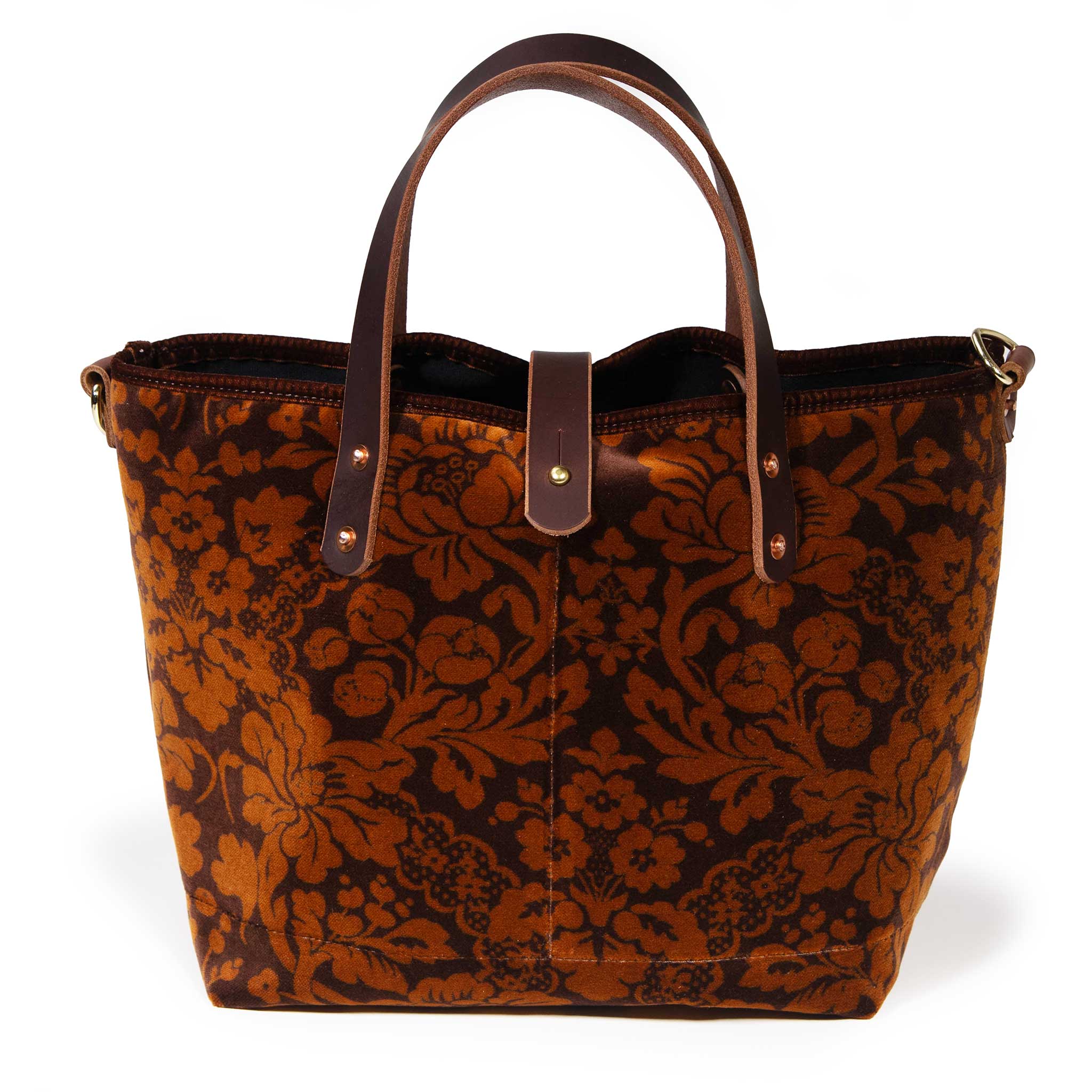 Inside, a split pocket keeps phone, wallet, keys, and glasses organized, while the roomy base and shallow profile make everything easy to see and grab. Rich mahogany leather handles and a matching center strap with solid brass closure add durability and polish, reinforced with copper rivets and velvet bound seams. A water-repellent cotton canvas lining keeps belongings protected.