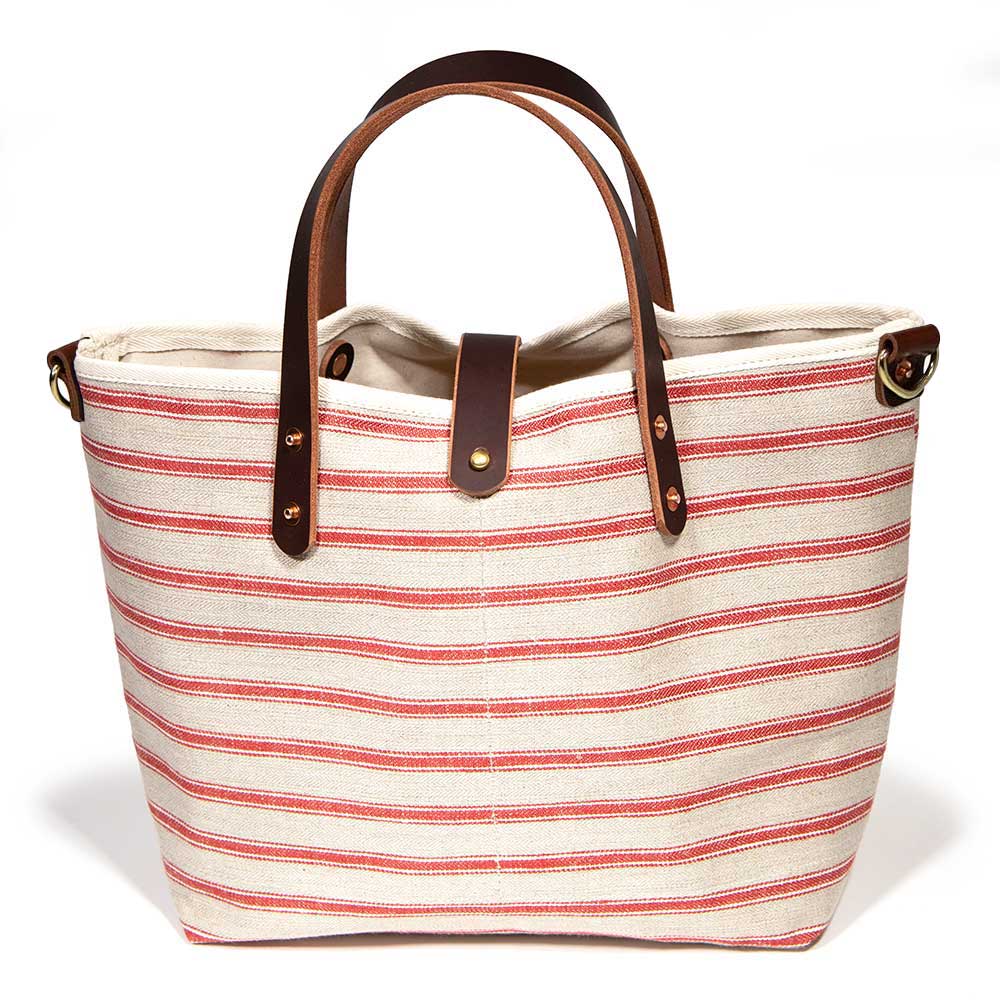 Our Sailor Stripe Mini is the perfect carry companion. Sized more like a handbag but with design features similar to a tote, this Mini Tote is perfect for stowing toys and treats for a walk with your dog, packing a lunchtime meal, or taking a book, water bottle, scarf, and sunglasses to the park.  A split internal pocket with two separate sides will safely hold your wallet, phone, keys, and glasses. Handles are made with mahogany brown leather and copper rivets make the bag more sturdy and a mahogany leather center strap with solid brass closure keeps your items safe. Shallow enough to see everything in the bag and with an extra-wide bottom, you will not feel like you are diving into a black hole to retrieve your belongings. All seams are bound for extra strength and the cotton canvas lining is water repellent. Made in the USA
